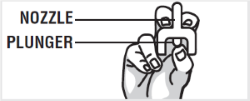 Hold Teva’s Naloxone HCl Nasal Spray with your thumb on the bottom of the plunger and your first and middle fingers on either side of the nozzle.